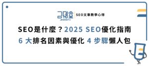 SEO補帖 SEO是什麼?2025 SEO優化指南,6大排名因素與優化4步驟懶人包 2025年絕對是SEO最風風雨雨的一年,從ChatGPT、Perplexity等 閱讀更多 » 13 6 月, 2025 尚無留言
